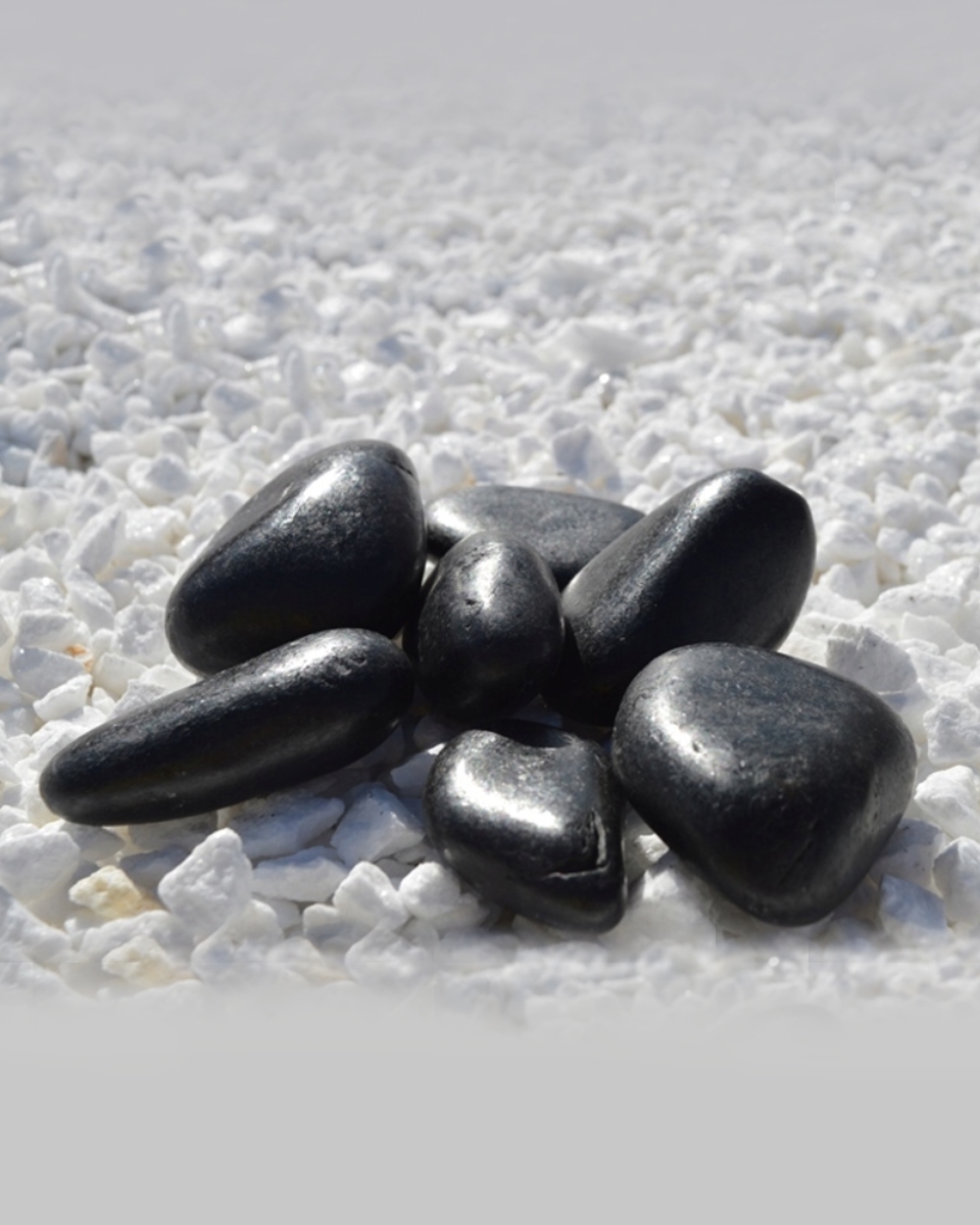 Naturalnie polerowane otoczaki pochodzące z dna oceanu, nienasycane i niewoskowane, zachowują autentyczny wygląd oraz trwałą, naturalną czerń. Ich gładka powierzchnia i głęboki kolor nadają aranżacjom nagrobnym elegancki charakter i doskonale komponują się z zielenią roślin. Po kontakcie z wodą czerń kamieni staje się jeszcze bardziej intensywna, podkreślając ich szlachetność i dekoracyjny efekt.