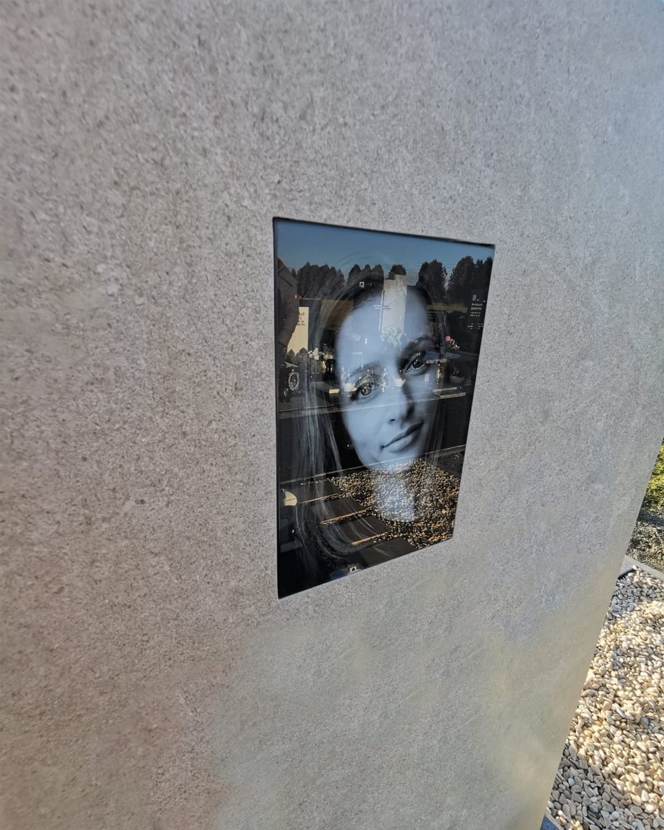 Zdjęcie na nagrobek wykonane w krysztale o minimalistycznej, prostej formie (bez fazowania), stworzone w trwałej, autorskiej technice wypalania obrazu bezpośrednio w krysztale — nie jest to laminat, który z czasem może tracić estetykę w warunkach zewnętrznych. Ponieważ fotografia stanowi ważny element całej kompozycji nagrobka, rekomendujemy wykonanie profesjonalnej obróbki graficznej przez naszego grafika.